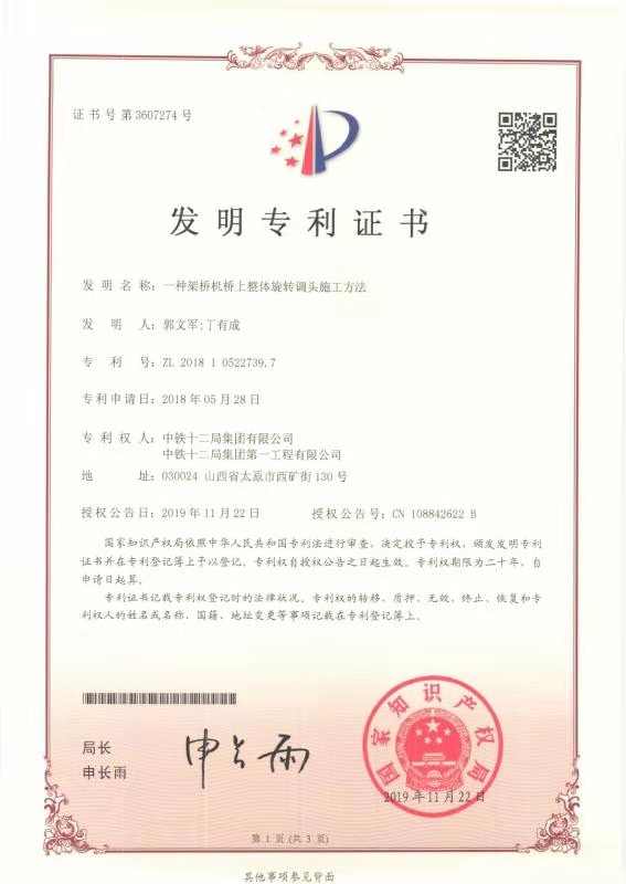 【发明专利证书】一种架桥机桥上整体旋转调头施工方法